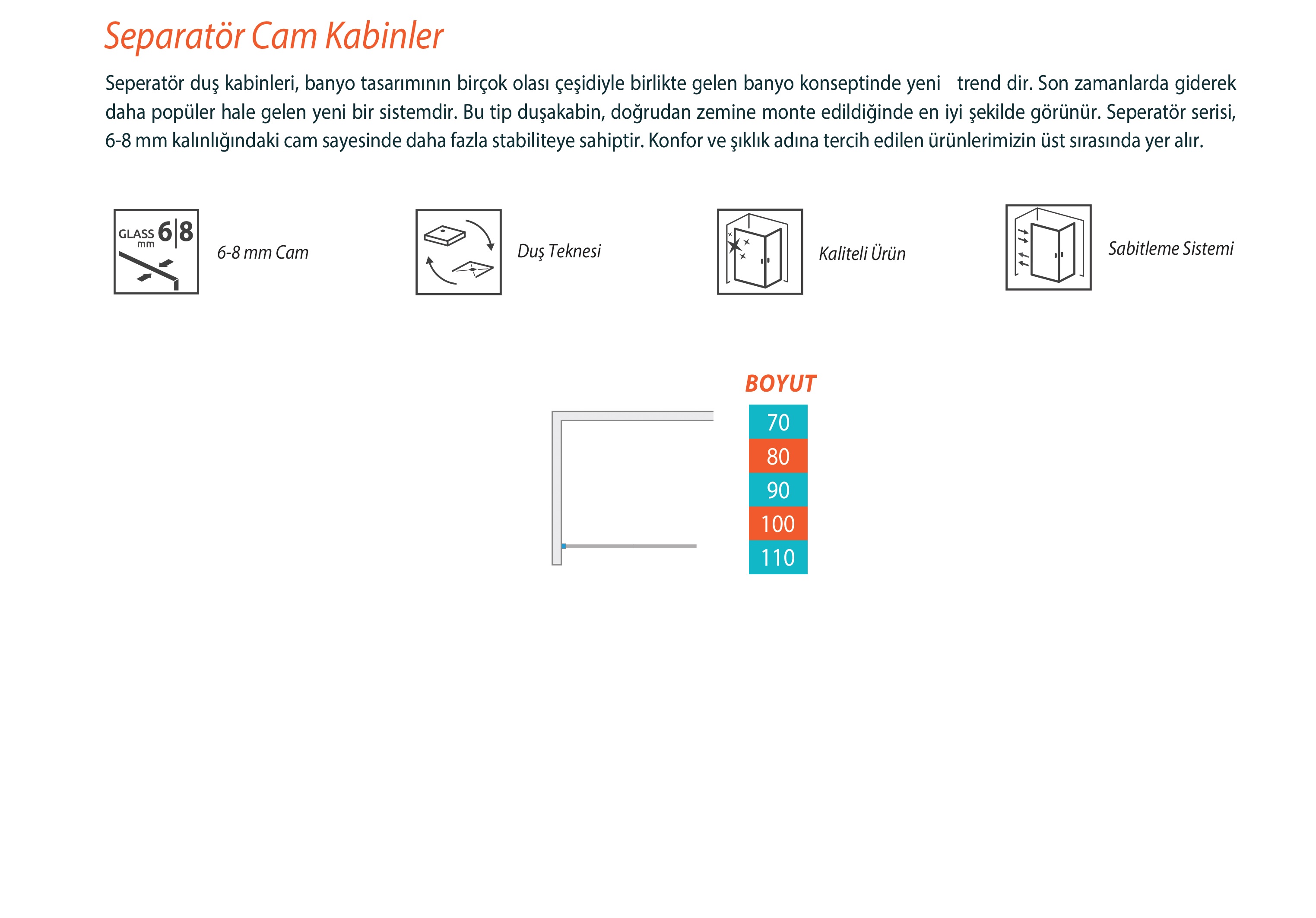 Seperatör duş kabinleri,banyo tasarımının birçok olası çeşidiyle birlikte gelen banyo konseptinde yeni trenddir.Son zamanlarda giderek daha popüler hale gelen yeni bir sistemdir.Bu tip duşakabin,doğrudan zemine monte edildiğinde en iyi şekilde görünür.Seperatör serisi, 6-8 mm kalınlığındaki cam sayesinde daha fazla stabiliteye sahiptir.Konfor ve şıklık adına tercih edilen ürünlerimizin üst sırasında yer alır.